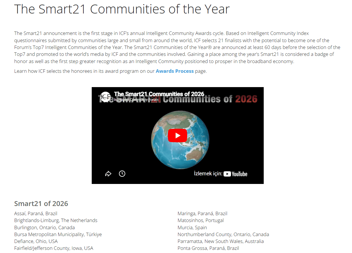 Altı kıtadan 200’den fazla kenti kapsayan ICF, şehirlerin teknolojiyi etkin kullanarak yaşam kalitesini artırmasını ve geleceğe sürdürülebilir çözümler üretmesini hedefliyor. Prestijli bu programda kentler dijital dönüşüm, sosyal kapsayıcılık ve sürdürülebilirlik gibi alanlarda titiz değerlendirmelerden geçiyor. Bursa, 2025’te dünyanın en akıllı yedi şehrinden biri olarak seçilmişti. 2026’da ise “Smart21” unvanıyla ilk 21 şehir arasındaki yerini korudu.